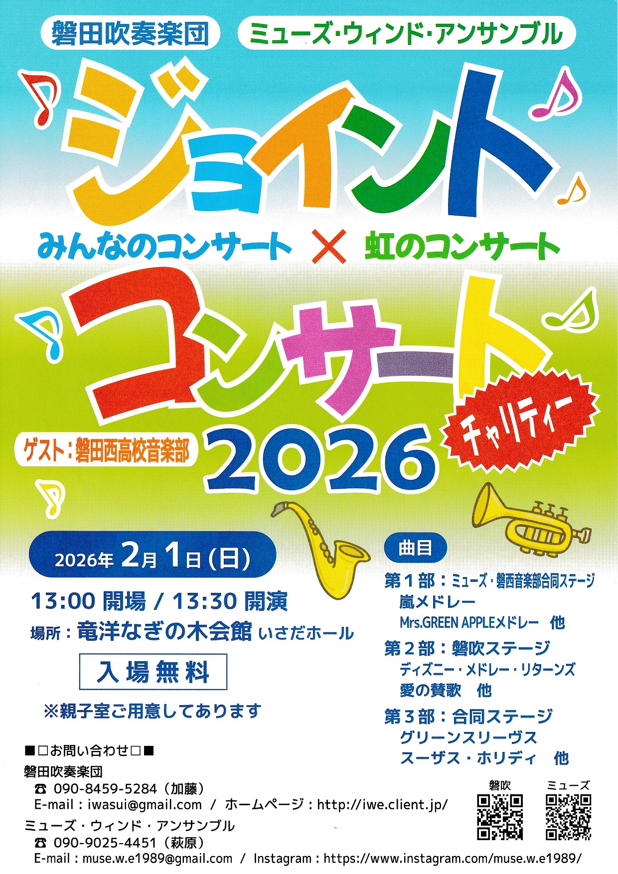 ジョイントコンサート 2026 開催期間 2026年2月1日(日) 開催場所 磐田市竜洋なぎの木会館 磐田吹奏楽団とミューズ・ウィンド・アンサンブルのジョイントコンサートです 詳しくは、下記のチラシをご覧ください