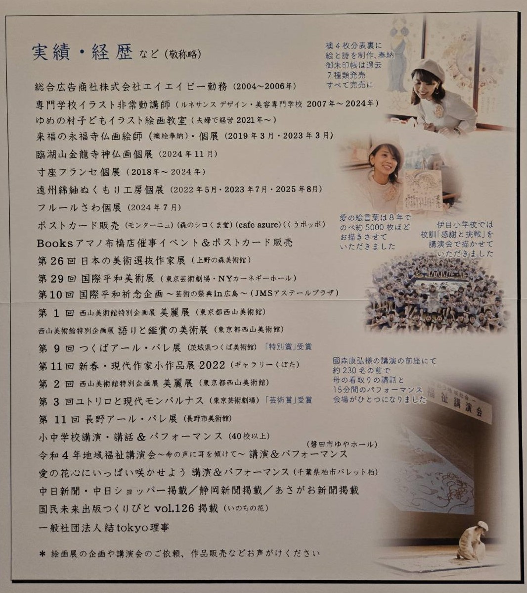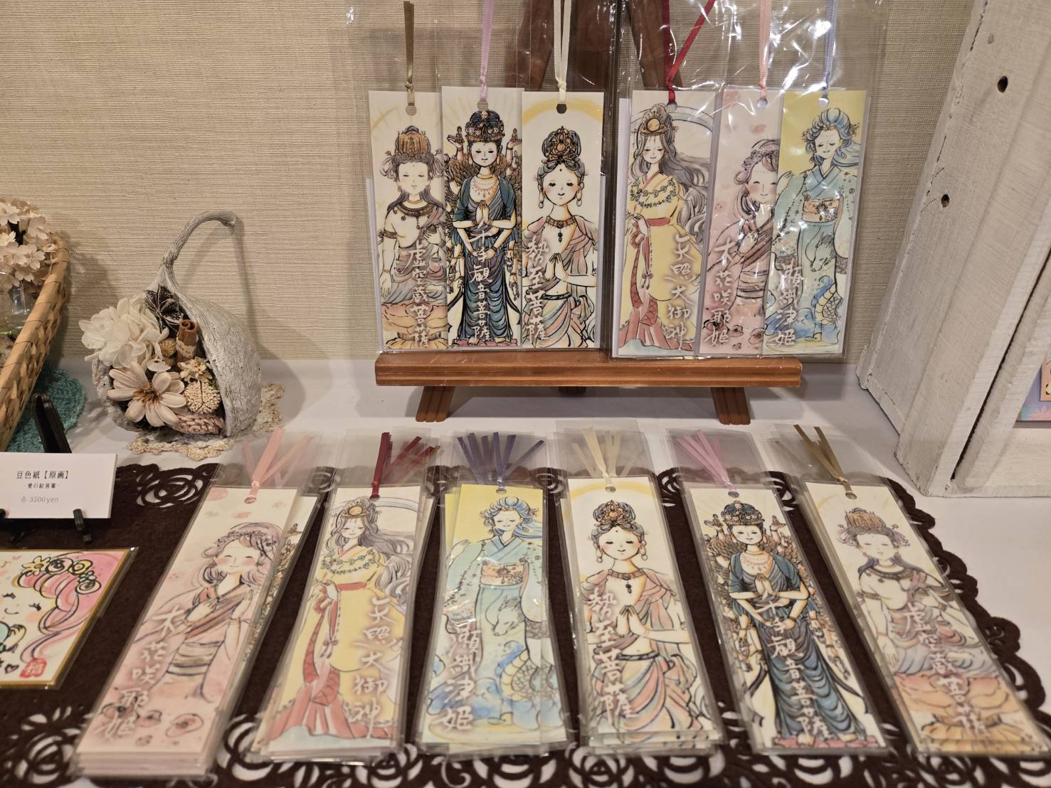また、作品に添えられた「いつもそばに在る有難さ」といった温かな言葉も、えだむらさん自身の魅力そのもの。会場では、日々の生活に癒やしを添えるレプリカやポストカード、彩り豊かな「しおり」などの販売も行っております。