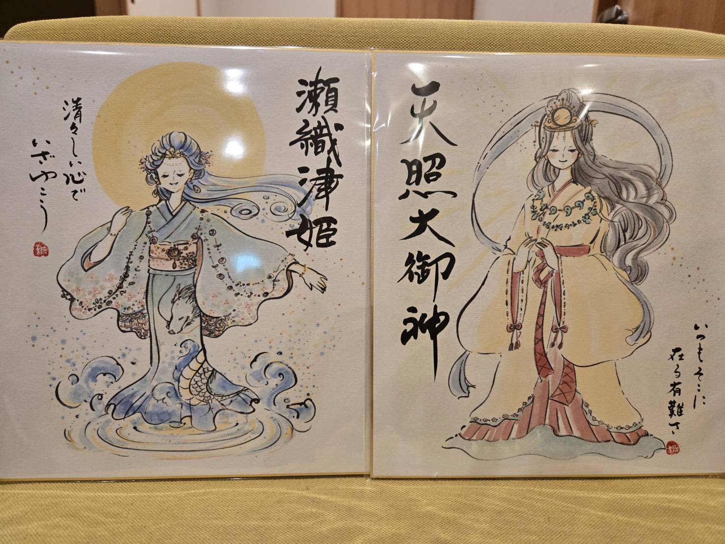 えだむらさんは、国内外の美術館での展示や寺院への奉納など、多方面で活躍されている実力派作家です。今回の個展では、瀬織津姫や天照大御神といった神々を描いた繊細な神仏画(原画)が会場を彩ります。柔らかな色彩で描かれた神様たちの表情は、どれも慈愛に満ちており、眺めているだけで心がふんわりと解きほぐされるような不思議な魅力に溢れています。